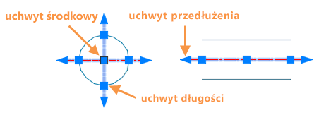 Uchwyty umożliwiają bezpośrednie manipulowanie znacznikami środka i osiami symetrii. W tym przykładzie linie środkowe na okręgu są modyfikowane oddzielnie. Przeciąganie uchwytu długości powoduje zmianę długości linii środkowej, a przedłużenie linii środkowej przesuwa się wraz z nią. Natomiast przeciągnięcie uchwytu przedłużenia powoduje zmianę tylko przedłużenia linii środkowej.