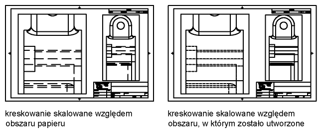 - Można tak ustawić wartość zmiennej systemowej PSLTSCALE, aby zachowane było takie samo skalowanie rodzaju linii dla obiektów wyświetlanych przy różnych współczynnikach powiększenia w układzie (obszar papieru) i w rzutni układu (obszar modelu). Na przykład: