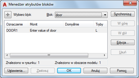 Pozwala edytować definicje atrybutów w blokach, usuwać atrybuty z bloków i zmienić kolejność, w jakiej będą się pojawiać monity dotyczące wprowadzania wartości atrybutów podczas wstawiania bloku.