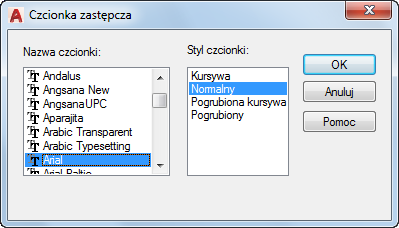 Jeśli czcionka zastępcza nie zostanie określona, to w przypadku, gdy otwierany rysunek zawiera czcionki, których nie można zlokalizować, zostanie wyświetlone okno dialogowe umożliwiające określenie czcionek używanych zamiast poszczególnych brakujących czcionek.