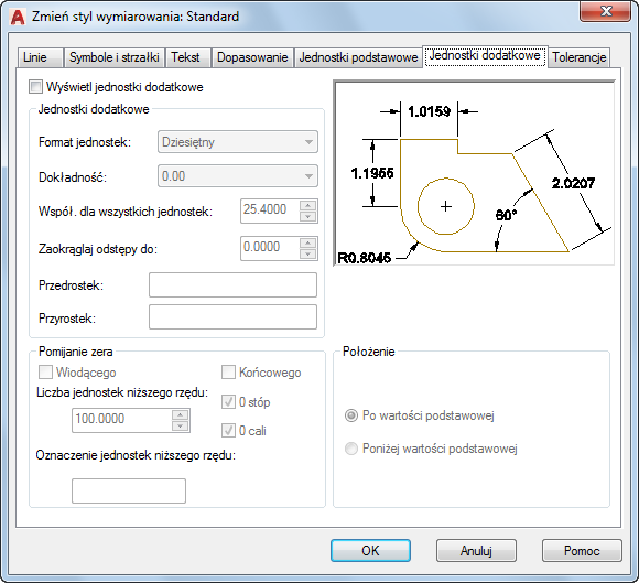 Określa wyświetlanie wymiarów w jednostkach dodatkowych oraz ustawia ich format i dokładność.