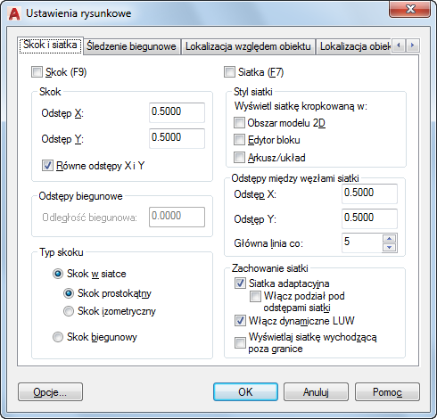 Jeśli wartość ta wynosi 0, to odległość skoku biegunowego przyjmuje wartość odstępu X. Ustawienie Odstępy biegunowe są wykorzystywane w połączeniu ze śledzeniem biegunowym i/lub śledzeniem obiektu. Jeśli żaden z dwóch rodzajów śledzenia nie jest dostępny, nastawy opcji Odległość biegunowa nie mają żadnego znaczenia.