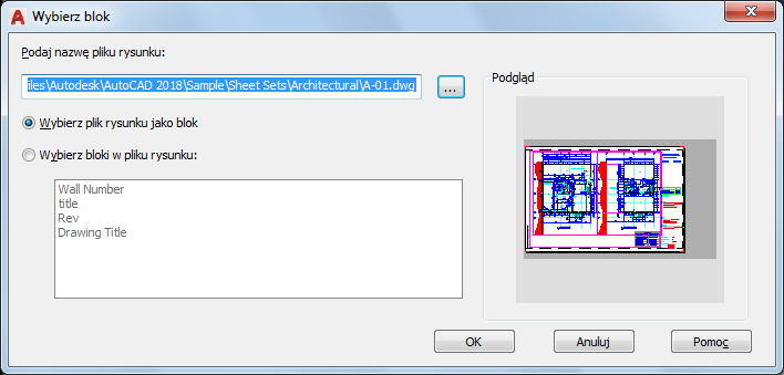 Wykorzystuje cały wybrany plik rysunku lub plik szablonu rysunku jako definicję bloku.