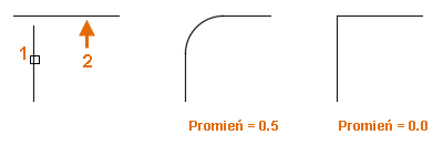 Uwaga: Jeśli promień zaokrąglenia wynosi 0, wybrane obiekty są ucinane lub wydłużane, dopóki się nie przetną; nie jest tworzony żaden łuk. Gdy promień zaokrąglenia wynosi 0, można usunąć segment łuku między dwoma segmentami prostoliniowymi lub wszystkie segmenty łuku z polilinii 2D.