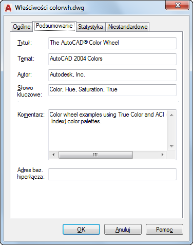 Określa autora rysunku. Nazwa autora może być wprowadzona lub zmieniona tylko przez uzytkownika. Aby zmienić nazwę autora, należy usunąć istniejącą nazwę i wprowadzić nową.
