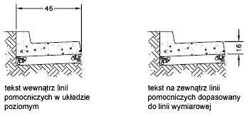 Bez względu na to, czy tekst jest w obrębie pomocniczych linii wymiarowych, czy poza nimi, można wybrać, czy ma być dopasowany względem linii wymiarowych, czy ma pozostać poziomy. Następujące przykłady pokazują dwie kombinacje tych opcji.