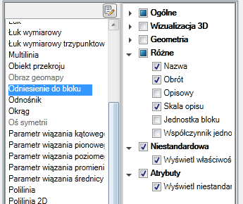 Gdy zaznaczone są kategorie Niestandardowe i Atrybuty, na palecie Szybkie właściwości są wyświetlane dynamiczne właściwości i atrybuty bloku.