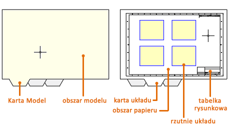 Obszar w obrębie układu nosi nazwę obszaru papieru. Można w nim dodać tabelkę rysunkową, wyświetlać skalowane widoki obszaru modelu w rzutni układu i tworzyć tabele, zestawienia, uwagi i wymiary dla rysunku.