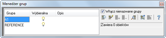 Jeśli grupa nie jest wybieralna, ikona żarówki nie będzie dostępna, zaś wybranie jednego elementu grupy nie spowoduje wybrania żadnego innego. Jeżeli zmienna systemowa PICKSTYLE ustawiona jest na 0, żadna grupa nie jest wybieralna.