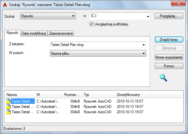 Znajduje pliki utworzone lub zmodyfikowane w podanym okresie. Wynikiem poszukiwań będą pliki, które spełnią kryteria określone na tej i na pozostałych kartach.