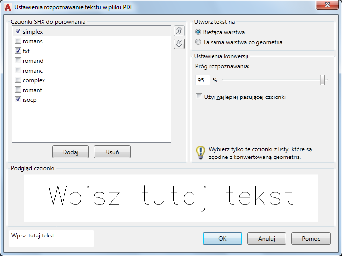 Wyświetla listę czcionek SHX w celu wybrania najlepiej pasujących do wybranej geometrii SHX. Kolejność wybranych czcionek SHX ma znaczenie. Wybrane czcionki są porównywane z wybraną geometrią SHX w celu dopasowania, zaczynając od góry listy, dopóki dopasowanie nie będzie równe podanej Wartości progowej rozpoznania. Przy użyciu przycisków strzałek można przesuwać wybrane czcionki w górę lub w dół listy. Niezaznaczone czcionki są ignorowane. Należy zwrócić uwagę na następujące kwestie: