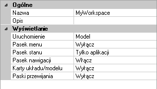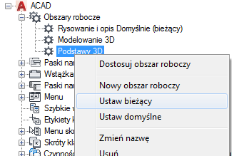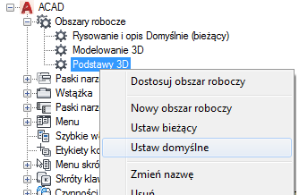 Obszary robocze w pliku CUIx mogą być oznaczane jako domyślne. Ustawienie obszaru roboczego jako domyślnego określa, że ma on zostać przywrócony podczas wczytywania pliku CUIx do programu po raz pierwszy lub po wczytaniu pliku CUIx za pomocą polecenia WCZYTAJCUI.