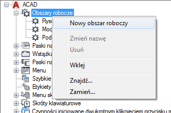Na karcie Dostosuj, w panelu Dostosowywane pliki: <nazwa pliku> kliknij prawym przyciskiem węzeł Obszary robocze, a następnie kliknij opcję Nowy obszar roboczy.