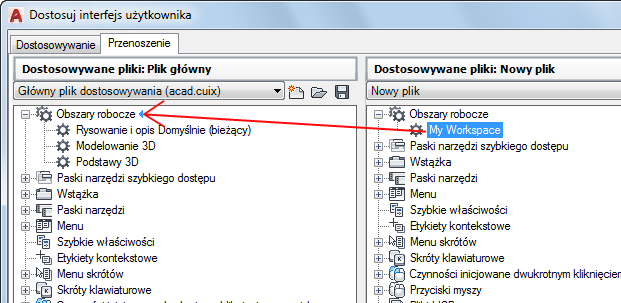 W panelu Dostosowywania w <nazwa pliku> (po prawej stronie) przeciągnij obszar roboczy z pliku CUIx do węzła Obszary robocze w głównym pliku CUIx w panelu Dostosowywania w <nazwa pliku> (po lewej stronie).
