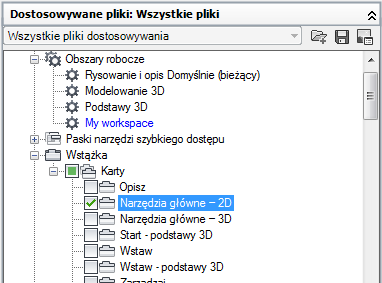 Uwaga: Obok węzłów paska narzędzi szybkiego dostępu, kart wstążki, pasków narzędzi, menu rozwijanych i częściowego pliku CUIx są teraz wyświetlane pola wyboru, więc można dodać elementy do obszaru roboczego.