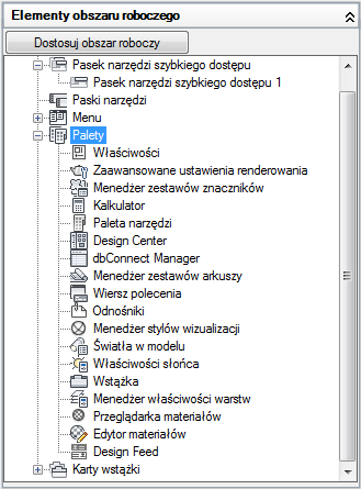 - Na karcie Dostosuj, na panelu Dostosowywane pliki: <nazwa pliku> kliknij znak plusa (+) obok węzła Obszary robocze, aby go rozwinąć.