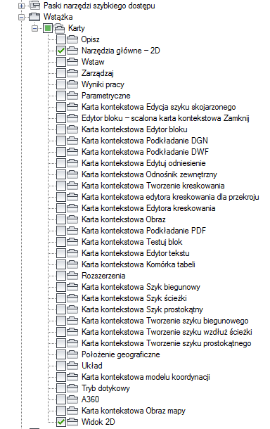 Za pomocą edytora CUI można sterować wyświetlaniem paska narzędzi szybkiego dostępu, kart i paneli wstążki, palet narzędzi, pasków narzędzi i menu rozwijanych.