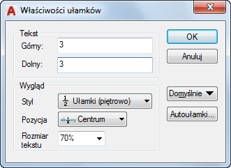 Wyświetla okno dialogowe Właściwości Autoułamków. Opcja Autoułamki od razu ustawia piętrowo znaki numeryczne znajdujące się bezpośrednio przed i za znakami daszka, ukośnika i krzyżyka.