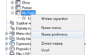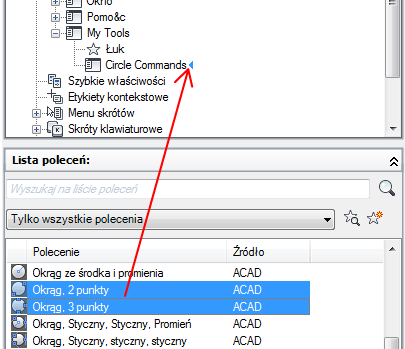 Przeciągnij z panelu Lista poleceń polecenie, które chcesz dodać, do podmenu w panelu Dostosowywane pliki: