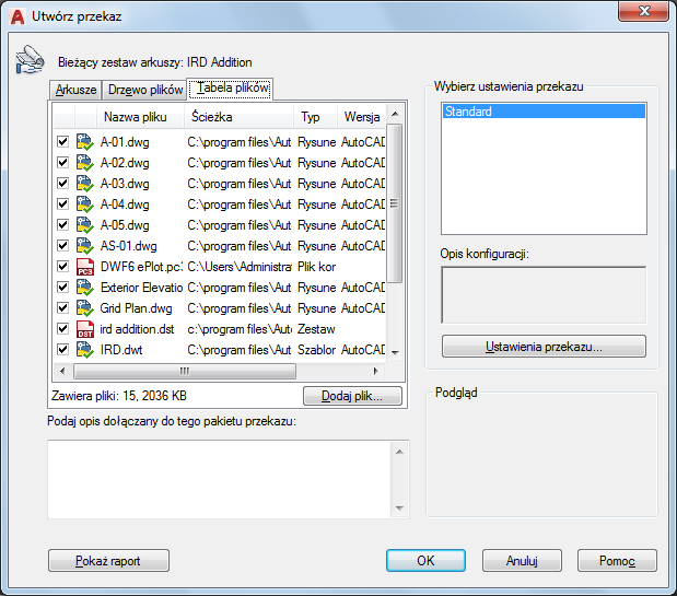 Domyślnie wyświetlane są wszystkie pliki skojarzone z bieżącym rysunkiem (zależne odnośniki zewnętrzne, style wydruku i czcionki). Możesz dodać pliki do pakietu przekazu lub usunąć z niego pliki istniejące. Pliki skojarzone przez URL nie są umieszczane w zbiorze przekazu.