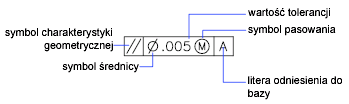 Symbol jest wstawiany do pola tekstowego Sym w oknie dialogowym Tolerancja geometryczna. Poniższa tabela opisuje każdy z symboli.