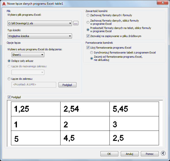 Importuje do rysunku formatowanie określone w oryginalnym pliki XLS, XLSX lub CSV, ale zmiany formatowania nie są uwzględniane w przypadku użycia polecenia AKTUALŁĄCZEDANYCH.