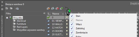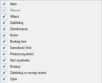 Wyświetla listę wszystkich kolumn według nazw. Znacznik wyboru wskazuje, że kolumna jest wyświetlana. Kliknij nazwę kolumny, aby wyświetlić lub ukryć kolumnę. Polecenia Zablokuj w rzutni, Szerokość linii rzutni, Rodzaj linii rzutni oraz Styl wydruku linii rzutni są dostępne tylko wtedy, gdy rzutnia układu jest aktywna.
