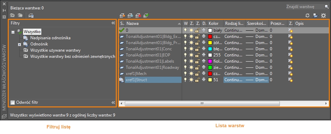 Można dodawać i usuwać warstwy, zmieniać ich nazwy i właściwości, ustawiać zastępowanie właściwości dla rzutni układu lub dodawać opisy warstw.