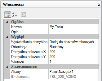 Uwaga: Zmiany wprowadzone tutaj we właściwościach paska narzędzi mają wpływ tylko na początkowy wygląd paska narzędzi po wczytaniu pliku adaptacji (CUIx). Zaleca się kontrolowanie wyglądu paska narzędzi za pomocą obszaru roboczego.