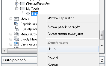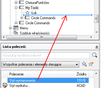 - Na panelu Lista poleceń przeciągnij polecenie, które chcesz dodać, do paska narzędzi na panelu Dostosowywane pliki: <nazwa pliku>.