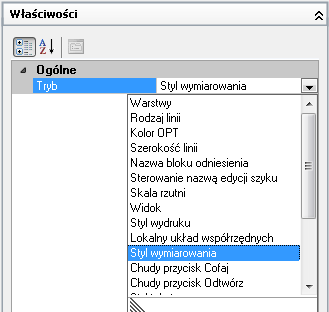 - Na panelu Właściwości, w polu Tryb kliknij strzałkę w dół, aby wyświetlić listę wszystkich dostępnych elementów sterujących paska narzędzi.