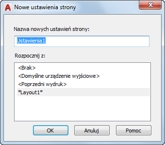 Ustala ustawienie strony, które zostanie użyte jako cecha początkowa dla nowych ustawień strony. Po kliknięciu przycisku OK wyświetlane jest okno dialogowe Ustawienia strony z ustawieniami wybranego ustawienia strony, które, jeśli trzeba, można zmodyfikować.
