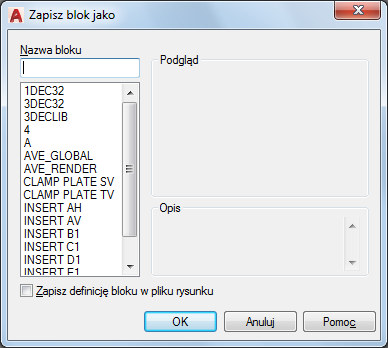Zapisuje definicję bloku jako plik rysunku. Wybranie istniejącego pliku rysunku spowoduje nadpisanie zapisanego pliku. Określona nazwa bloku jest domyślnie uznawana za nazwę pliku rysunku.