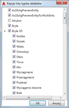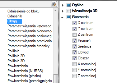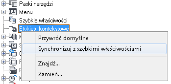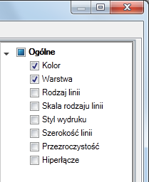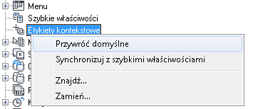 Jeśli właściwość jest zaznaczona, wówczas jest wyświetlana w etykiecie kontekstowej, gdy wskaźnik zostanie umieszczony na obiekcie tego samego typu w oknie rysunku. Należy usunąć znacznik wyboru znajdujący się obok właściwości, aby usunąć właściwość wybranego typu obiektu.