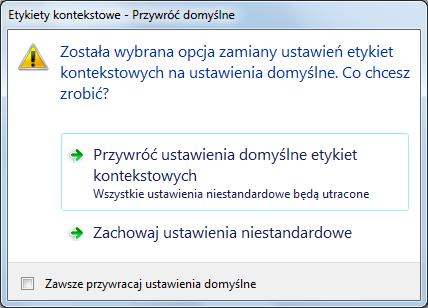 Jeśli typ obiektu jest zaznaczony, właściwości dla tego typu obiektu są wyświetlane w etykiecie kontekstowej, gdy kursor zostanie umieszczony na obiekcie tego samego typu. Należy usunąć znacznik widniejący obok typu obiektu, aby ten typ przestał być obsługiwany w etykietach kontekstowych.