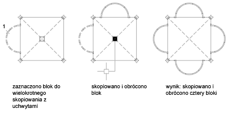 Przykładowo, korzystając z opcji Kopiuj, można obrócić wybrane obiekty, pozostawiając kopie we wszystkich miejscach określanych za pomocą urządzenia wskazującego.