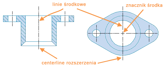 Znaczniki środka i linie środkowe są używane jako odniesienia wymiarowania środków otworów i osie symetrii.