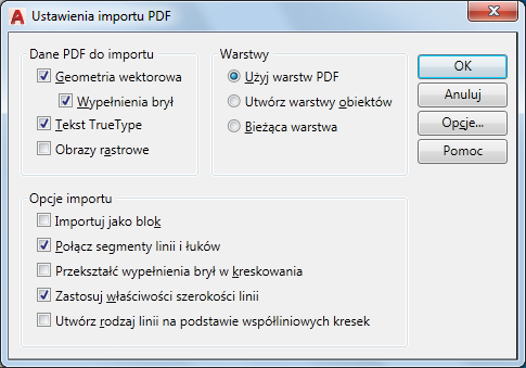 Określa opcje importowania geometrii, wypełnień, obrazów rastrowych i obiektów tekstu TrueType z określonego pliku PDF.