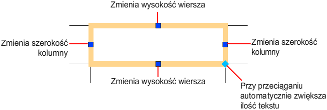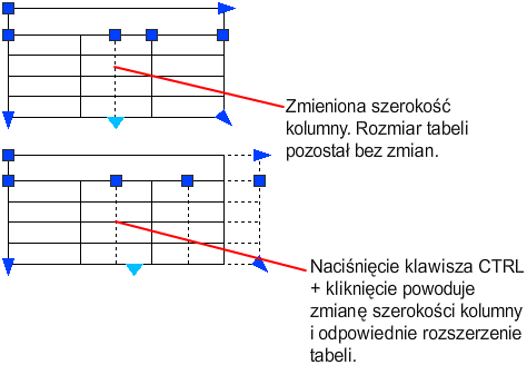 Gdy zostanie zmieniona wysokość lub szerokość tabeli, wówczas zmieni się jedynie wiersz lub kolumna sąsiadująca z zaznaczonym uchwytem. Zostanie zachowana wysokość i szerokość tabeli. Aby zmienić wielkość tabeli proporcjonalnie do wielkości edytowanego wiersza lub kolumny, należy podczas używania uchwytu kolumny przytrzymać naciśnięty klawisz Ctrl.