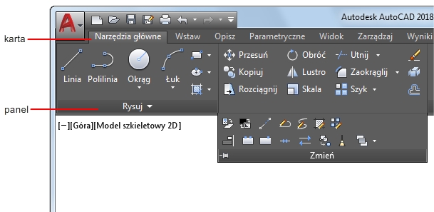 Wstążka udostępnia kompaktową paletę wszystkich narzędzi potrzebnych do utworzenia lub zmodyfikowania rysunku. Może się znajdować w następujących miejscach: