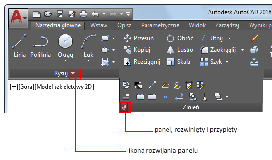 Panel wstążki można wyciągnąć na obszar rysunku lub dodatkowy monitor. Panel ruchomy pozostanie otwarty, dopóki nie nastąpi powrót do wstążki, nawet w przypadku przełączenia karty wstążki.