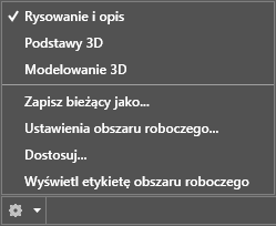 W przypadku produktów działających w systemie operacyjnym Windows obszar roboczy składa się z kart i paneli wstążki, menu, pasków narzędzi i palet, które stanowią niestandardowe, zadaniowe środowisko rysunku. Można zmienić wstążkę na inną, zmieniając obszar roboczy. Na pasku stanu kliknij ikonę Przełączanie pomiędzy obszarami roboczymi i wybierz żądany obszar roboczy. Tutaj na przykład przedstawiono początkowe obszary robocze dostępne w programie AutoCAD.
