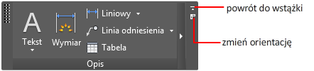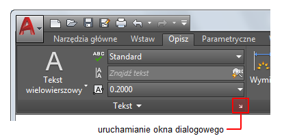 W niektórych panelach wstążki jest wyświetlane okno dialogowe powiązane z danym panelem. Aby wyświetlić powiązane okno dialogowe, kliknij element uruchamiający okno dialogowe oznaczony ikoną strzałki,