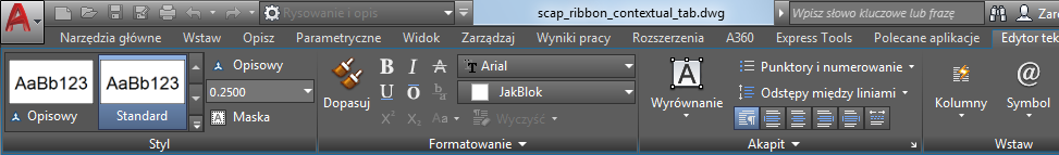 Po wybraniu określonego typu obiektu lub rozpoczęciu niektórych poleceń zostanie wyświetlona kontekstowa karta wstążki zamiast paska narzędzi bądź okna dialogowego. Karta kontekstowa jest zamykana po zakończeniu polecenia.