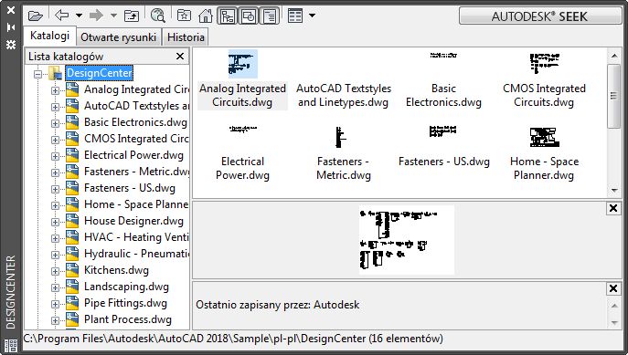 Wyświetla pliki i foldery na komputerze i dyskach sieciowych, listę otwartych rysunków i historię ostatnich lokalizacji, które odwiedzono. Wybierz pozycję w widoku drzewa, aby wyświetlić jego zawartości w obszarze zasobów.