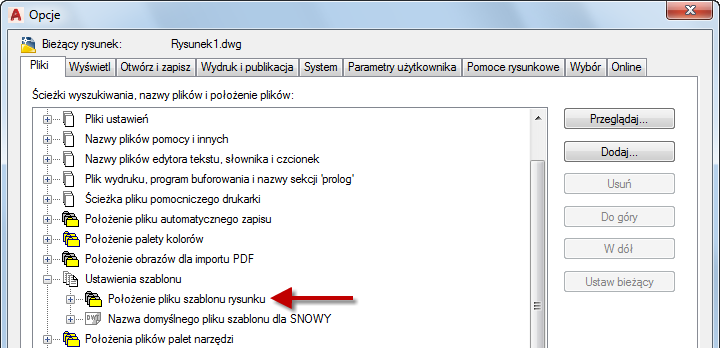 Pliki szablonów rysunków (DWT) służą do tworzenia nowych rysunków. Rysunki utworzone za pomocą pliku DWT zawierają wszystkie style i obiekty rysunkowe zdefiniowane w pliku DWT. Niestandardowe pliki DWT z poprzedniej wersji są migrowane do podfolderu o nazwie utworzonej od wersji programu, z której zostały migrowane; konwencja nazewnictwa podfolderu to Szablony produktu nazwa produktu. Podfolder Szablony produktu nazwa produktu jest tworzony w folderze zdefiniowanym ustawieniem Położenie pliku szablonu rysunku.