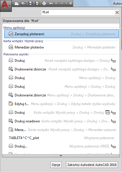 Pole wyszukiwania poleceń jest wyświetlane na górze menu aplikacji. Wyniki wyszukiwania mogą zawierać polecenia menu, podstawowe etykiety narzędzi i ciągi tekstowe wiersza polecenia. Można wprowadzić dowolny wyszukiwany termin w dowolnym języku. Wyniki można zastosować do bieżącego obszaru roboczego.
