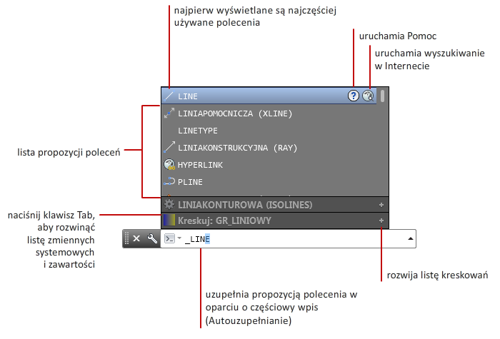 - Lista propozycji zawiera polecenia, które zawierają wpisywane znaki, a także polecenia, które się od nich rozpoczynają.