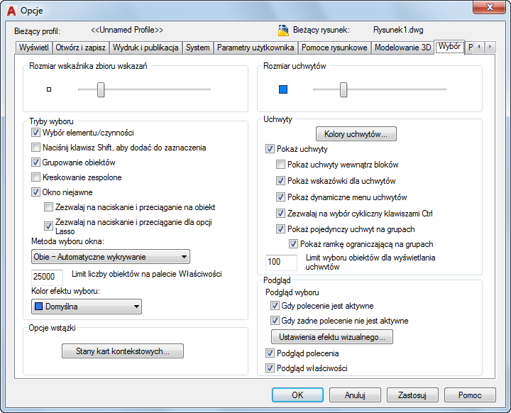 Steruje ustawieniami związanymi z metodami wyboru obiektów.