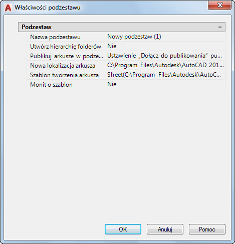 Określa plik szablonu rysunku (DWT) i nazwę układu, który zostanie użyty do tworzenia nowych plików rysunków dla tego podzestawu.